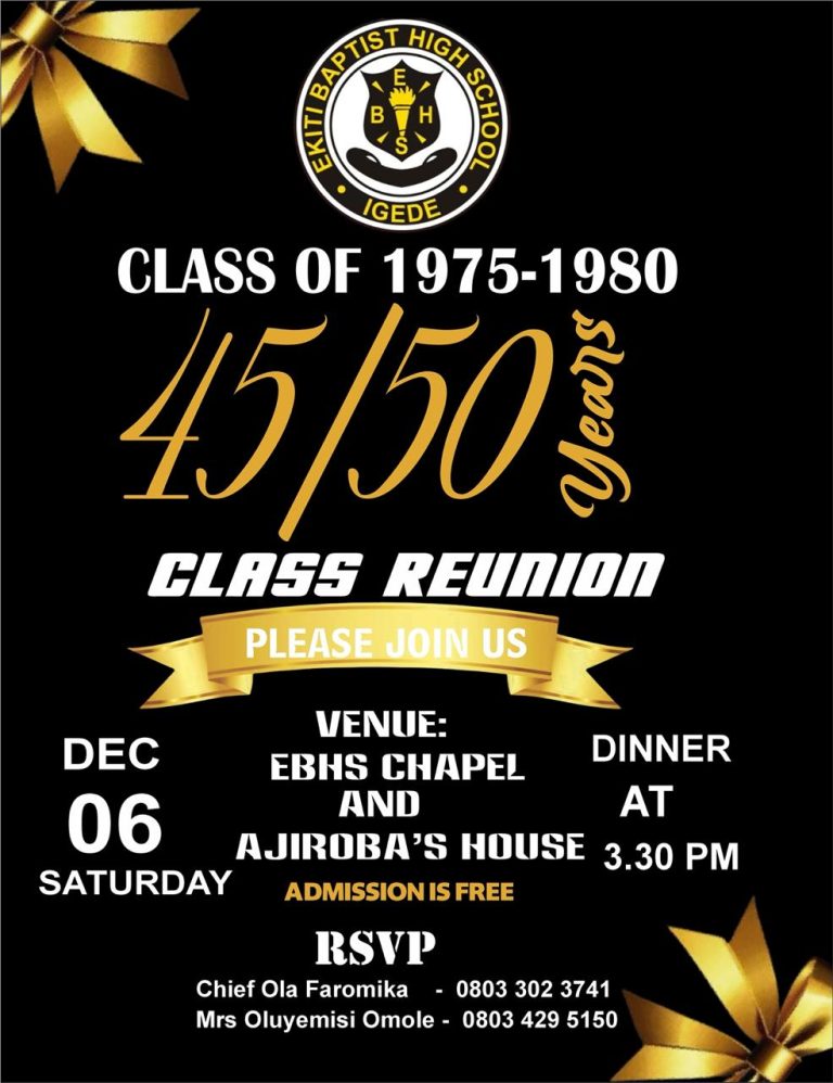 On behalf of my set, the 1975-80 set of EBHSOSA, I Bashorun Ola Faro, The Chairman of the Reunion planning Committee of the set would like to invite you to our Reunion program taking place at Igede as in the above flyer. We would be honoured by your presence at our Dinner later on Saturday evening as stated on the flyer notification.  Thank you for for your attention and best regards from all of us.